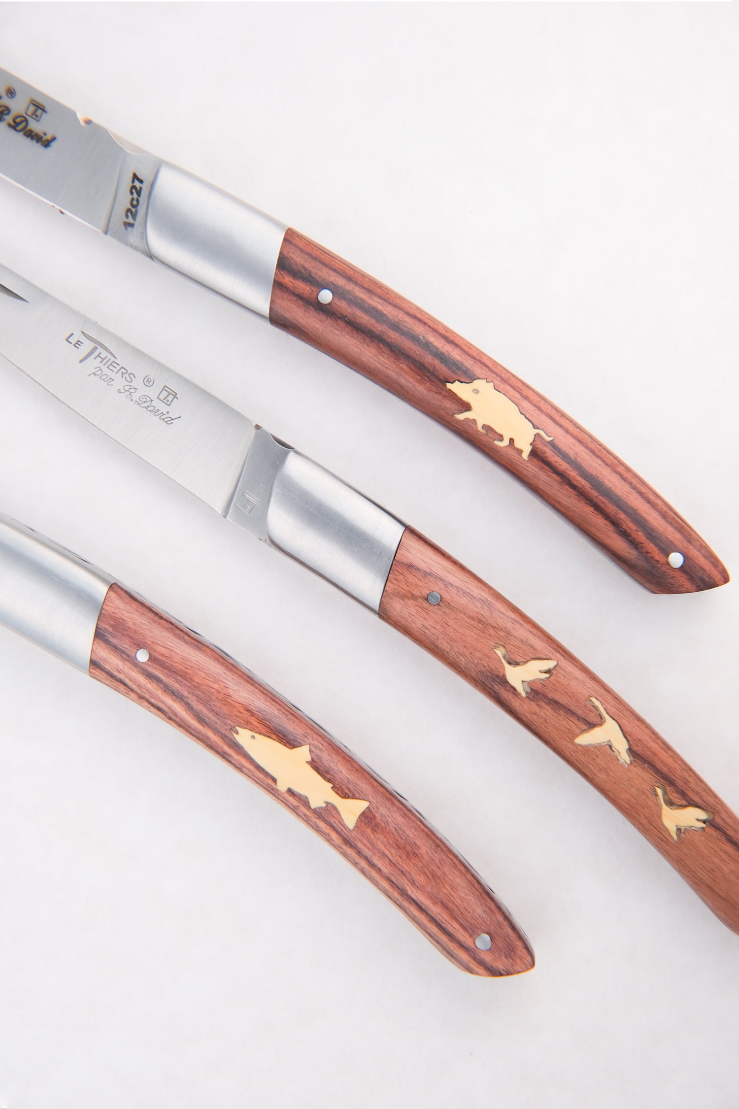 Trio of kingswood inlayed knives in the exclusive Le Thiers form. Produced by Coutellerie R. David. Click the link below to see the Boar, Flying Ducks and Salmon in more detail.