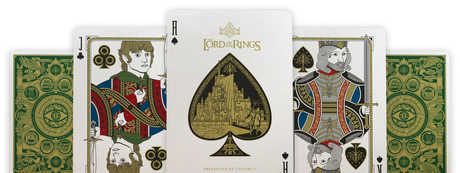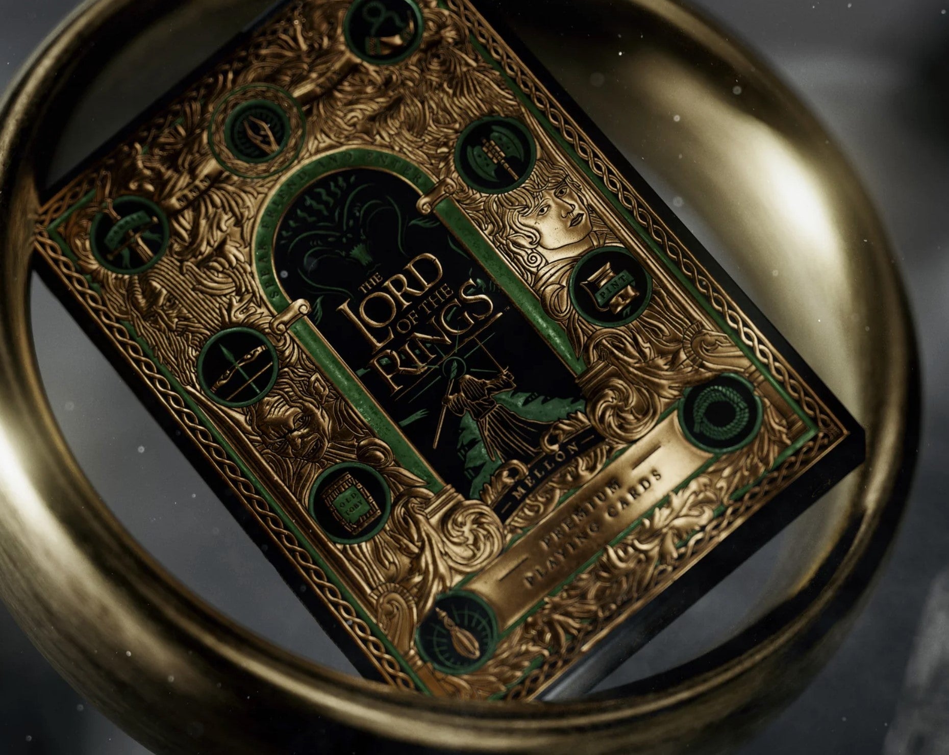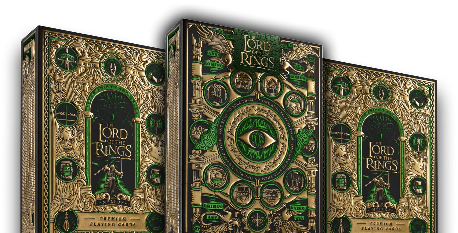 This premium box set includes four decks (4th deck behind middle deck): two standard edition and two special GOLD FOIL edition Lord of the Rings Playing Cards, with glistening gold foil on the back of each card. The box set is secured with a magnetic enclosure - and a map of Middle Earth inside!