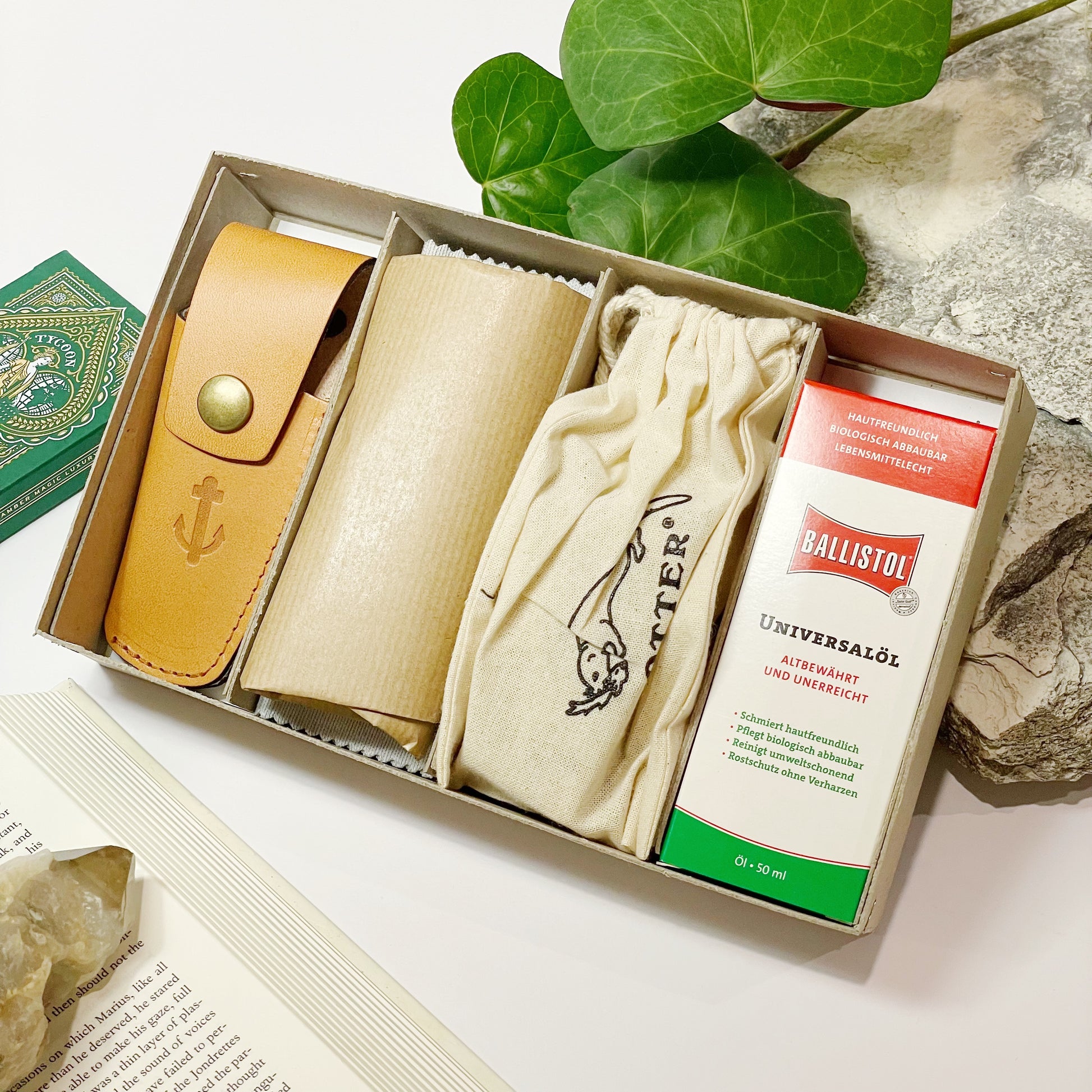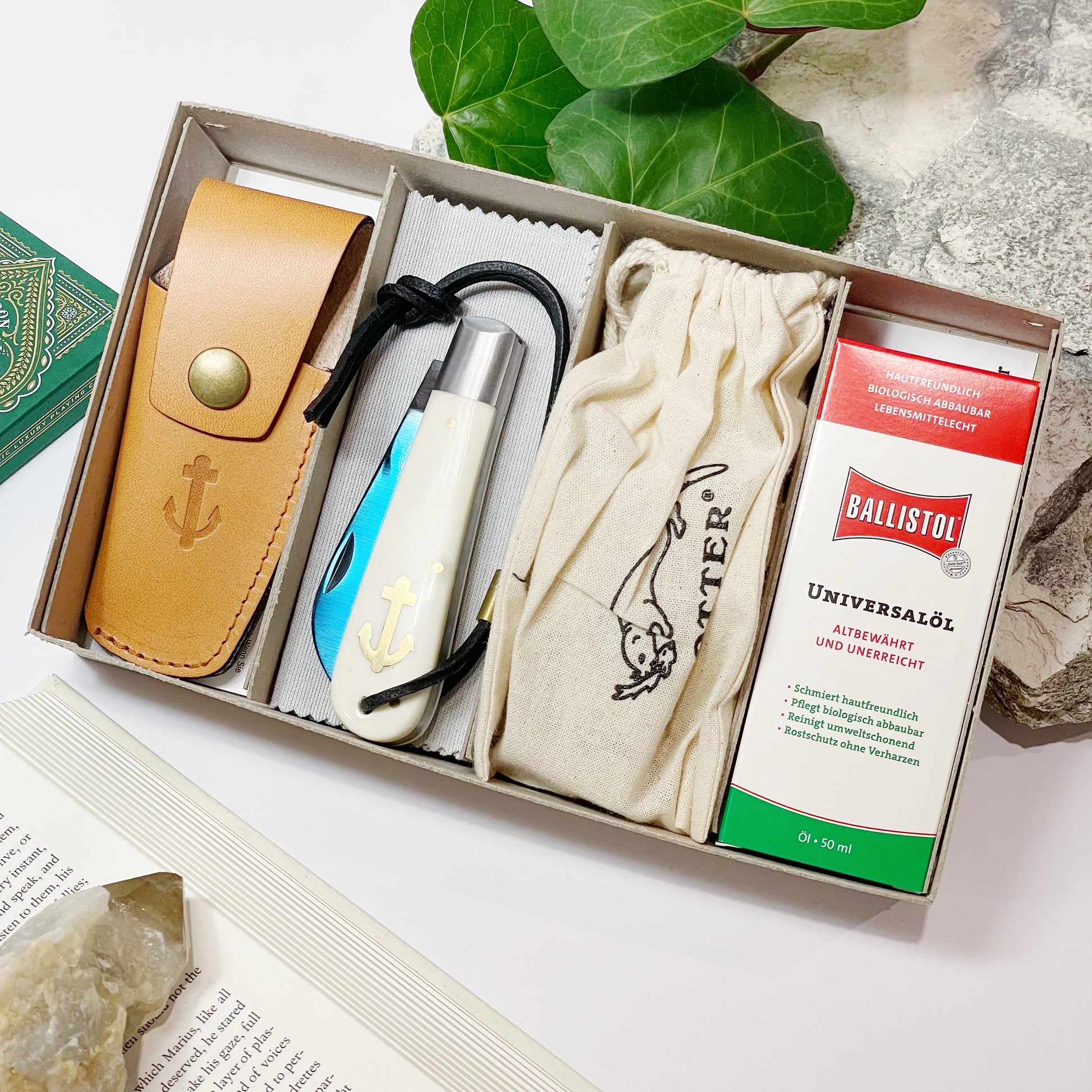 Made in Germany, Otter Messer has created a well rounded gift set. It consists of our anchor knife in either Sapeli, Smoked Oak and Bone. The blade is made of reliable C75 carbon steel. The leather holster with belt loop is embossed with an anchor and is the ideal complement for the anchor knife. The Belgian whetstone helps retaining the sharp edge of the pocket knife for a long time. The set is completed by a small flask of Ballistol oil, which is perfect to care for your Anchor Knife and leather holster. All parts of this set are also available separately.