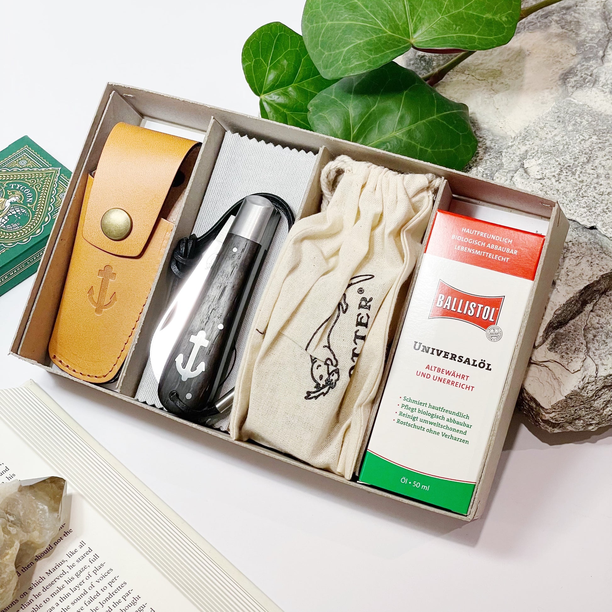 Made in Germany, Otter Messer has created a well rounded gift set. It consists of our anchor knife in either Sapeli, Smoked Oak and Bone. The blade is made of reliable C75 carbon steel. The leather holster with belt loop is embossed with an anchor and is the ideal complement for the anchor knife. The Belgian whetstone helps retaining the sharp edge of the pocket knife for a long time. The set is completed by a small flask of Ballistol oil, which is perfect to care for your Anchor Knife and leather holster. All parts of this set are also available separately.