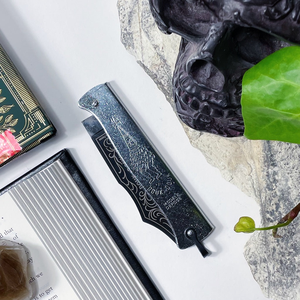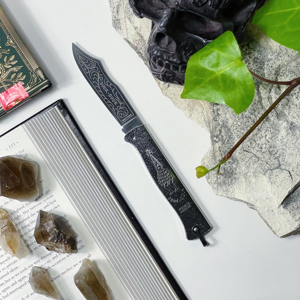 Designed and made in France, the Douk-Douk is an iconic and historical pocket knife. The patterned blade takes a sharp edge due to its high carbon steel construction. Featuring a folded steel handle, scimitar shaped blade and emblazoned with the logo of the Melanesian God of Doom and Chaos, the knife takes on a dark and ominous design. A wonderful utility knife and a great gift, this will become a cherished addition to your daily essentials.