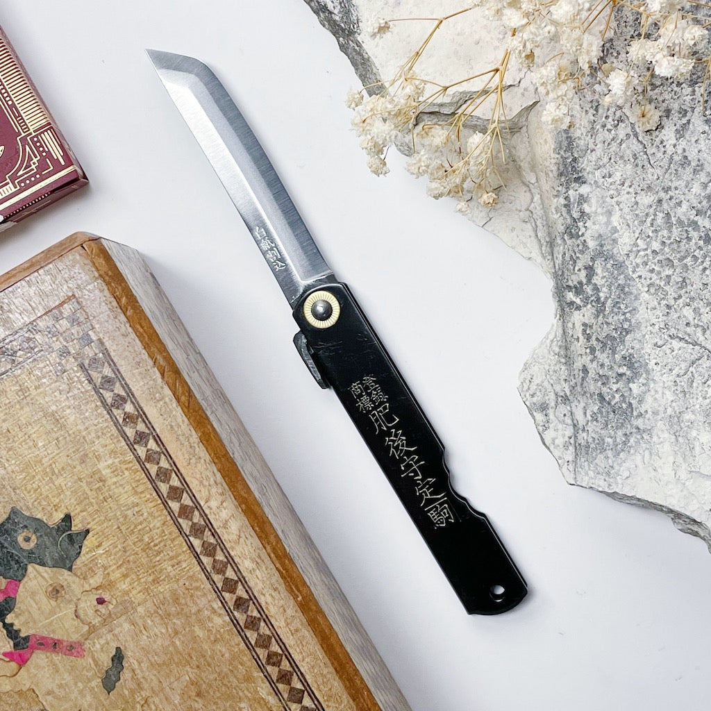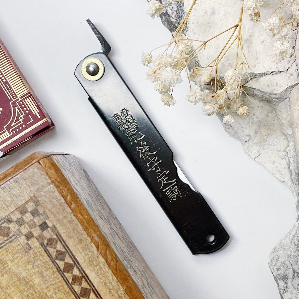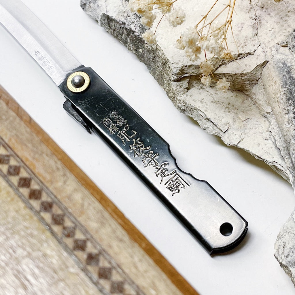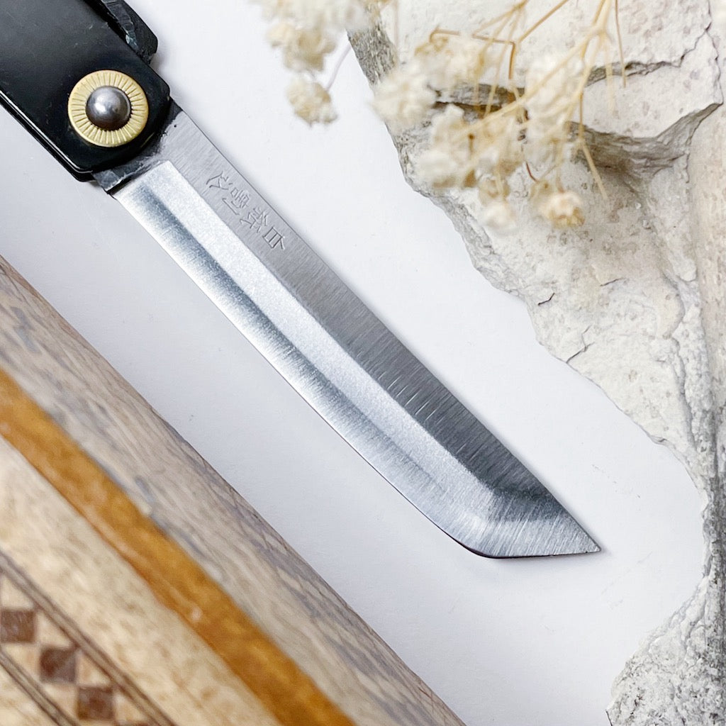 Designed and made in Japan by 6 skilled artisans, the Higonokami is an iconic and historical pocket knife. This traditional blade is a friction folder or 'Penny Knife', meaning, it uses the friction of the swivel and the pressure of the user's thumb on it's iconic lever or 'Chikiri' to keep it open.
