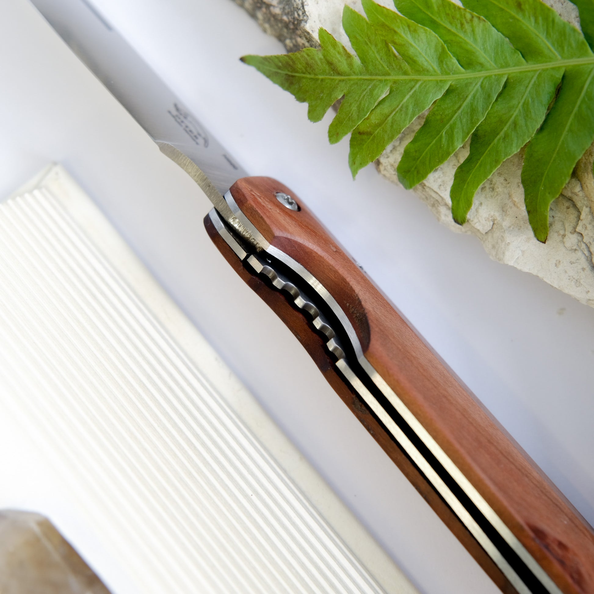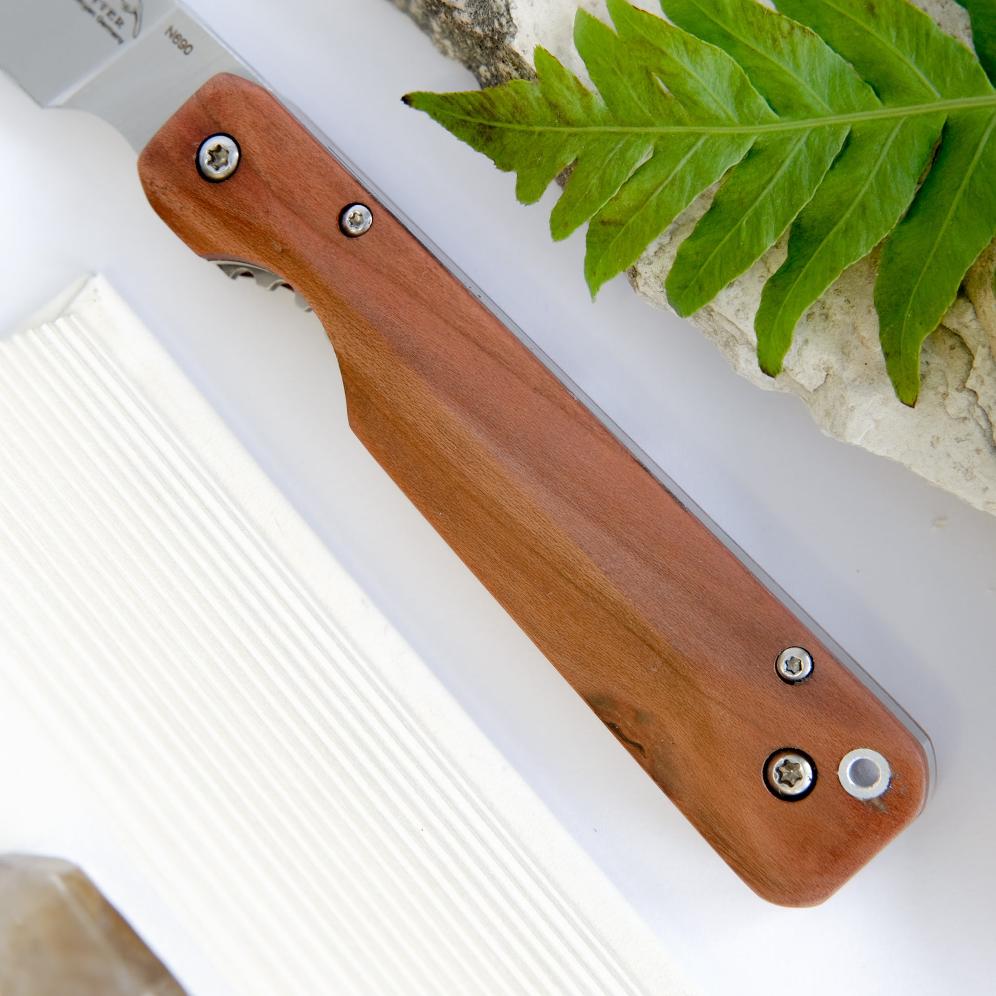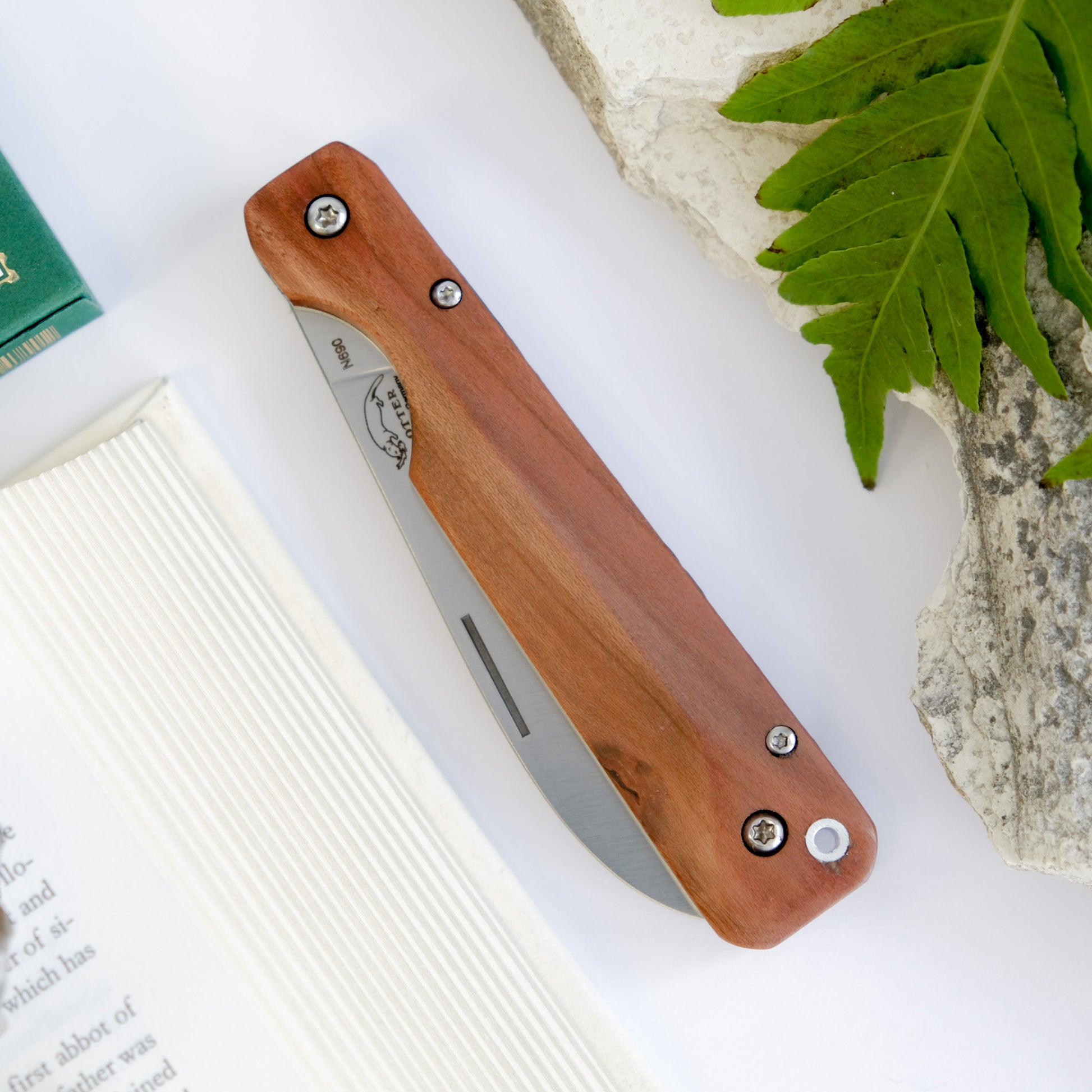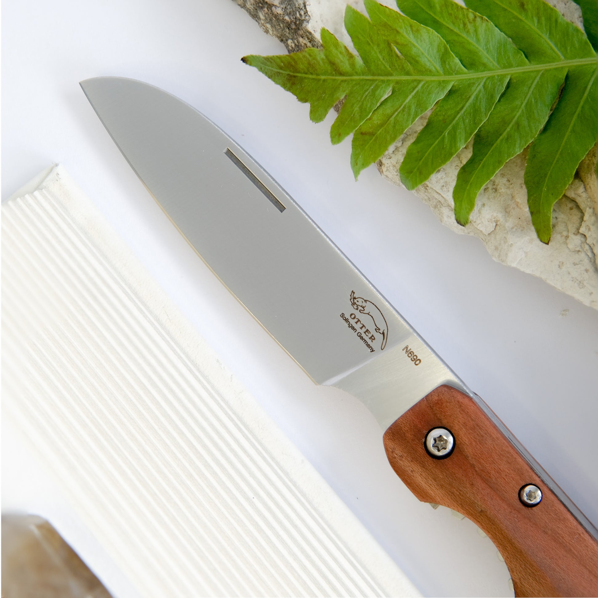Made in Germany, the Liner-Lock pocket knife by Otter-Messer has modern cues with traditional elements. The handle, made with Plum Tree Wood has beautiful colour, and is presented in a 'screwed down' geometric shape that is both stylish and ergonomic. The blade with nail nick, contrcuted with N690 stainless steel, comes in a practical sheepfoot form. The liner-lock on the underside, provides ese of use with added security. A wonderful utility knife and a great gift, this will be a cherished addition to your daily essentials.