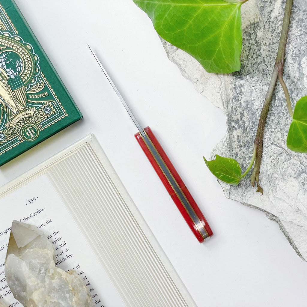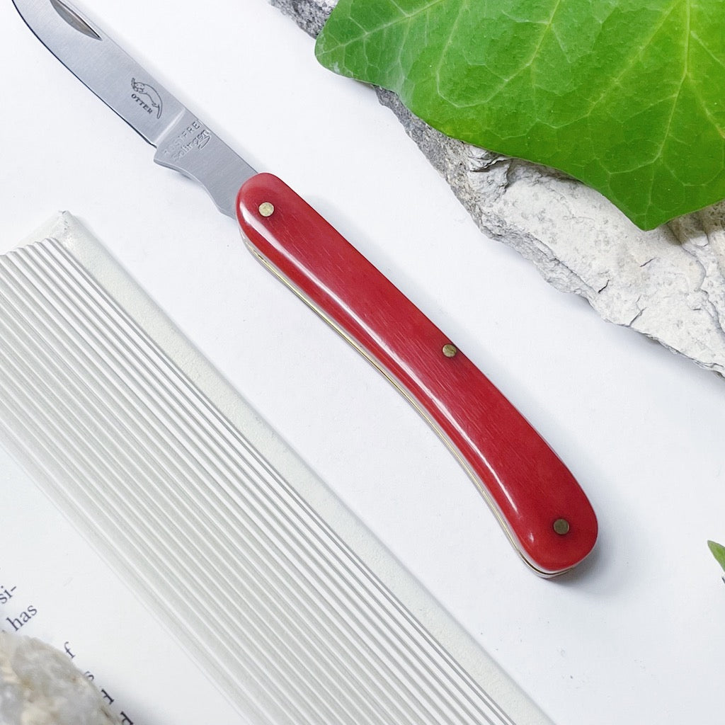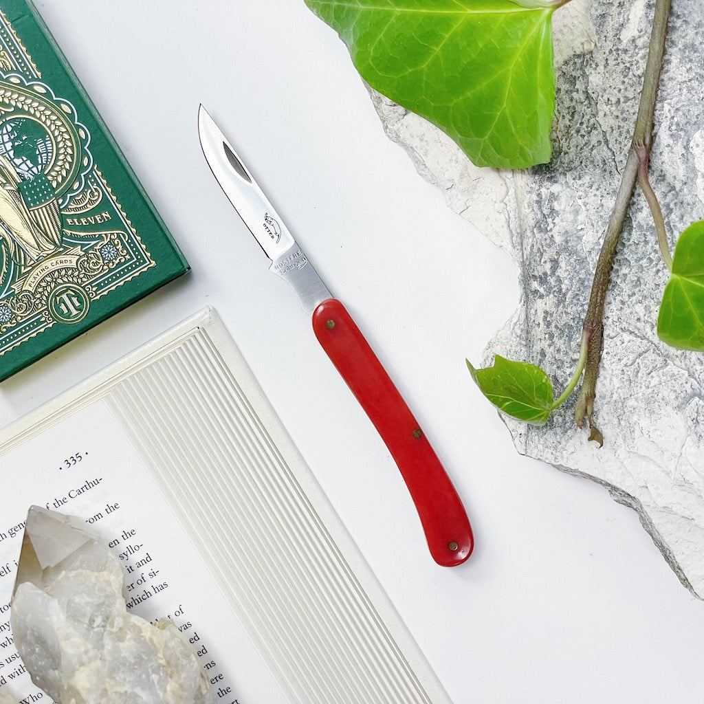 Made in Germany by Otter-Messer, the Little Doctor pocket knife is a unique blade with historical roots. The overall design was popularised by veterinarians. The handle is made from dyed camel bone and polished to a glossy finish that feels nice to the touch. The straight back blade with nail-nick reflects the shape of a doctors scalpel with a finger rest towards the tang for better blade control. It is contructed with reliable stainless steel. The slipjoint design provides ease of use. This is a small blade compared to other pocket knives however it's design and contruction is like no other, which makes it a truely special blade. A wonderful utility knife and a great gift, this will be a cherished addition to your daily essentials.