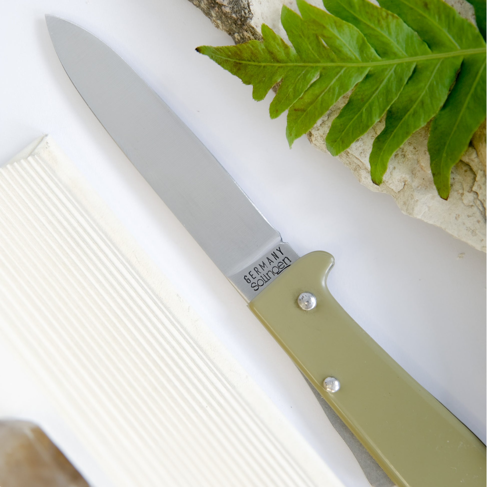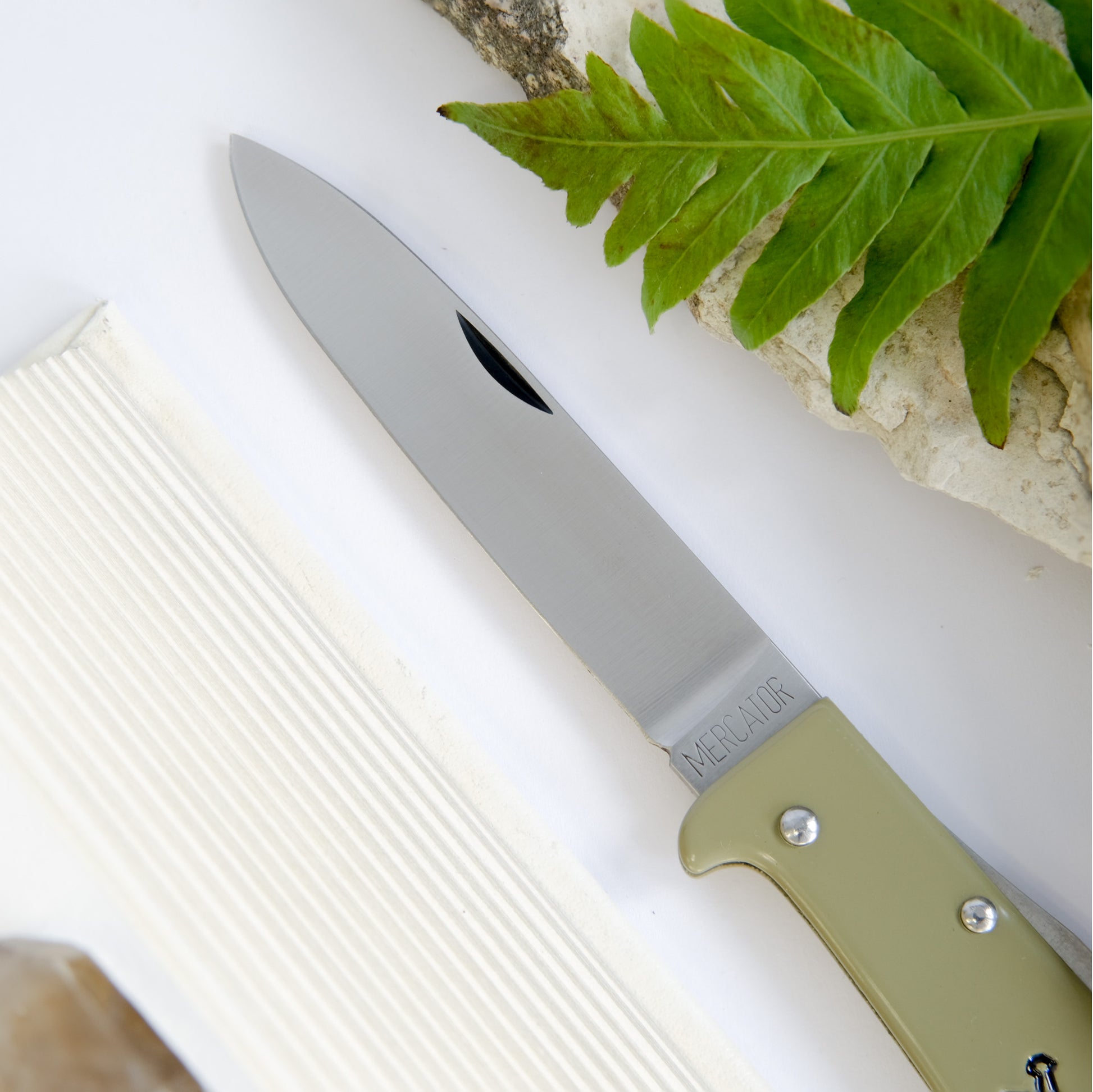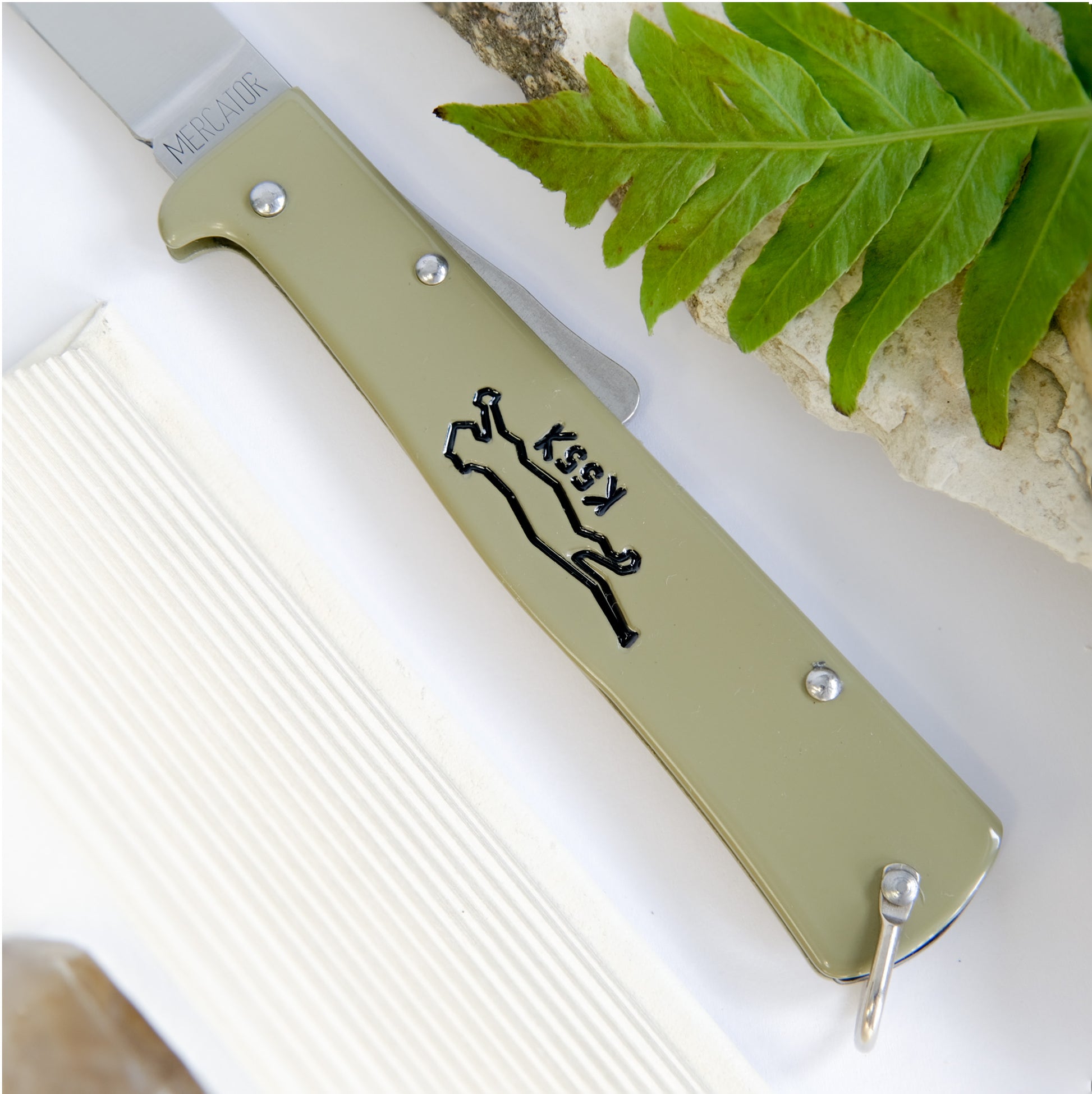 Made in Germany by Otter-Messer, the Mercator pocket knife is an iconic blade with historical roots. This is a special variation from the original colour way, now arriving in olive green with a black k55k logo. The spear pointed blade with nail-nick measures 110mm in length and is constructed with reliable C75 carbon steel. The lock back design gives you confidence with every slice. A wonderful utility knife and a great gift, this will be a cherished addition to your daily essentials.