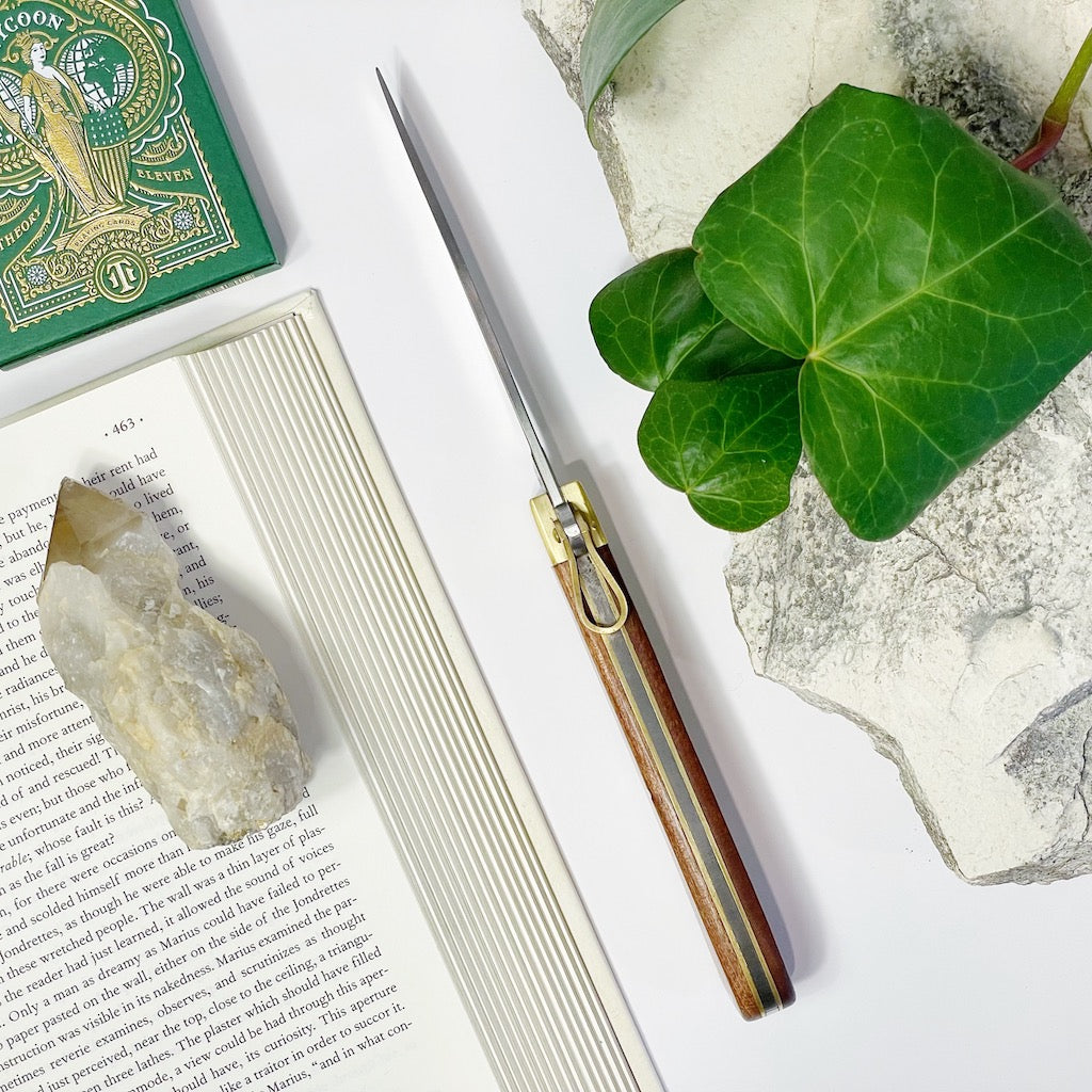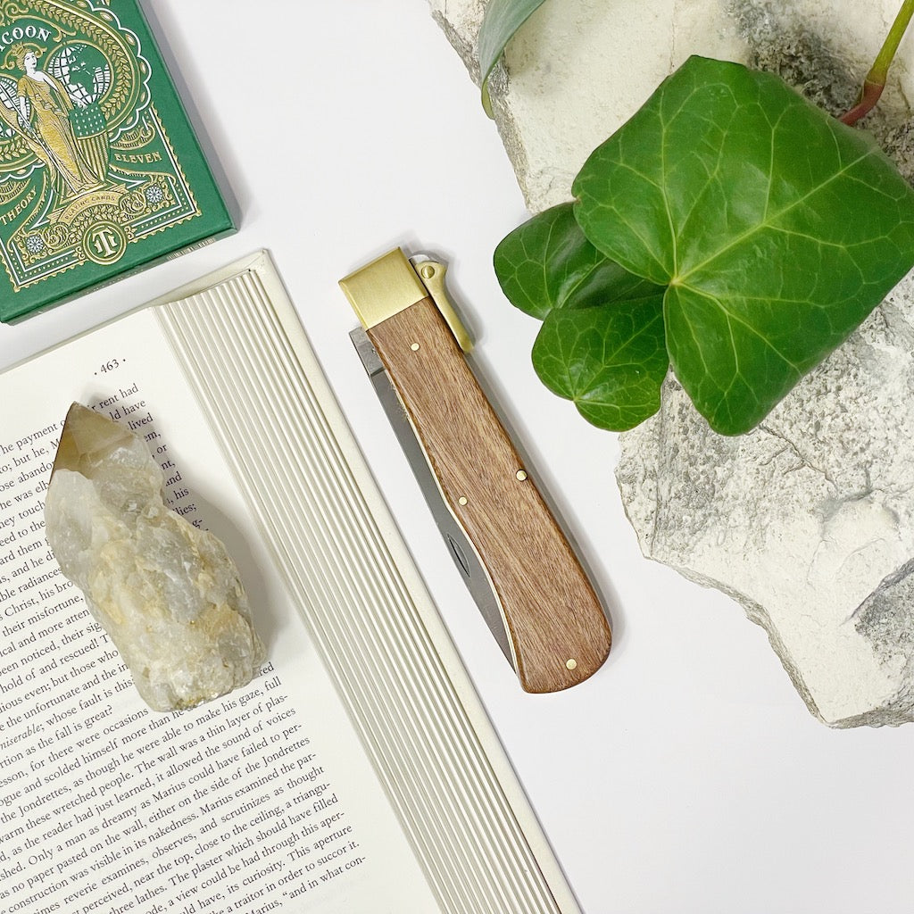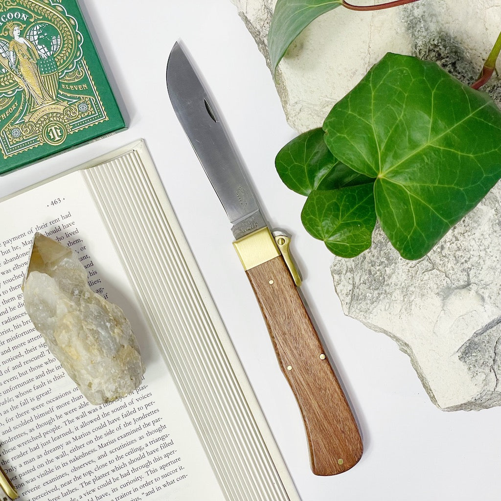 The plates, pins and bolsters are made of brass. The straight back blade with nail-nick is contructed with reliable C75 carbon steel. The loop that sits on the back of the spring is moved 180 degrees to unlock the blade. A wonderful utility knife and a great gift, this will be a cherished addition to your daily essentials.